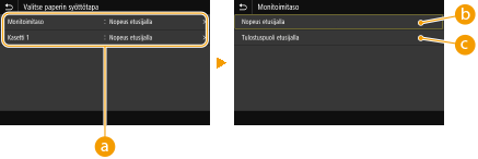 <Monitoimitaso> <Nopeus etusijalla>  <Tulostuspuoli etusijalla> <Kasetti 1> <Nopeus etusijalla>  <Tulostuspuoli etusijalla> <Kasetti 2>* <Nopeus etusijalla>  <Tulostuspuoli etusijalla> |