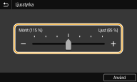 Du kan ändra en mängd skärmrelaterade inställningar, t.ex. vilket språk som ska visas: <Skärminställningar> Du kan ändra den skärm som automatiskt visas när enheten inte har använts under en viss angiven tid: <Funktion eft. autoåterställn.> Du kan ändra olika inställningar för att underlätta användningen av enheten, t.ex. skärmens ljusstyrka: <Hjälpmedel> |