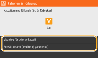 Meddelandet informerar dig om att tonerpatronen snart behöver bytas ut. Se till att ha en ny tonerpatron till hands. Byt tonerpatron om du ser det här meddelandet innan du ska börja skriva ut ett stort jobb. Det visas när <Åtgärd vid varning> är inställt på <Avbryt utskrift> (