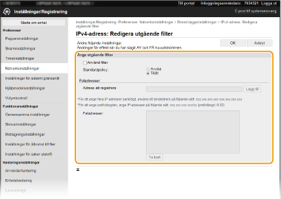 1 | Markera kryssrutan [Använd filter] och klicka på [Avvisa] eller [Tillåt] för att välja [Standardpolicy]. [Använd filter] Markera kryssrutan om du vill begränsa kommunikationen. Avmarkera kryssrutan för att inaktivera begränsningen. [Standardpolicy] Välj förhandsvillkor för att tillåta eller avvisa andra enheters kommunikation med enheten. [Avvisa] | Välj det här alternativet om du bara vill godkänna kommunikationspaket när de skickas till eller kommer från enheter vars IP-adresser angetts i [Feladresser]. Kommunikation med andra enheter förbjuds. | [Tillåt] | Välj det här alternativet om du vill blockera kommunikationspaket när de skickas till eller kommer från enheter vars IP-adresser angetts i [Feladresser]. Kommunikation med andra enheter tillåts. |