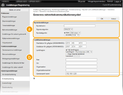 Välj nyckelgenereringsalgoritmen i [RSA] eller [ECDSA] och välj sedan nyckellängd i listrutan. Ju större tal för nyckellängden desto högre säkerhetsnivå. Dock blir kommunikationen långsammare.
