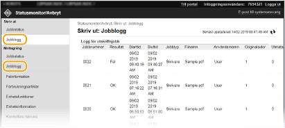 Oavsett inställningarna för Hantering av avdelnings-ID visas alla dokument som just nu skrivs ut eller som väntar på utskrift. Om du angett ditt användarnamn när du loggat in i allmänt användarläge visas bara användarnamnet i dina dokument som du skrivit ut. Klicka på [Jobbnummer] i pausade och säkra dokument om du vill visa detaljerad information. Du kan kontrollera användarnamn och sidantal för utskrivna dokument. |