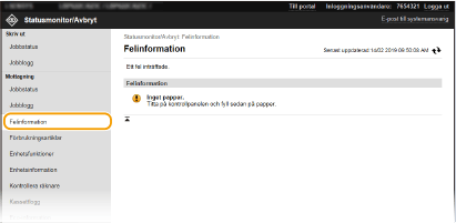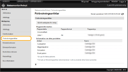 Papperskällans pappersformat och papperstyp, tonerpatronens modellnummer etc. visas. Du kan även klicka på [Kontrollera information om förbrukningsartiklar] på portalsidan (huvudsidan) för att visa den här sidan (