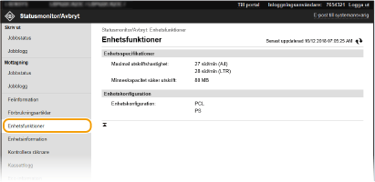 Maximal utskriftshastighet och enhetens funktioner visas.