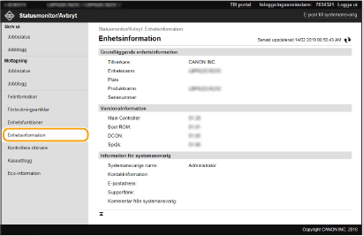 Information om enheten och systemansvarig visas. Enhetsnamnet och annan systemhanteringsinformation visas här enligt inställningarna i [Information för systemansvarig] på sidan [Användarhantering] eller i [Enhetsinfo-inställningar] på sidan [Enhetshantering].
