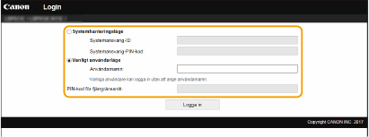 Du har åtkomst till alla åtgärder och inställningar i fjärranvändargränssnittet. Ange ditt ID i [Systemansvarig-ID] och PIN-koden i [Systemansvarig-PIN-kod].