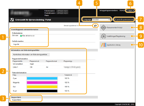 När du loggar in till fjärranvändargränssnittet öppnas följande portalsida. Det här avsnittet beskriver objekten som visas på portalsidan samt grundläggande funktioner.