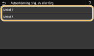För LBP664Cx / LBP663CdwFörbättringen är större med <Metod 2> än med <Metod 1>. Försök att justera med <Metod 1> först. Anger du en större förbättringseffekt kan det resultera i att utskrifterna rullar sig eller utskriftshastigheten blir lägre. För LBP623Cdw / LBP621CwOm du anger <På> kan efterbilder uppträda på tomma områden. |