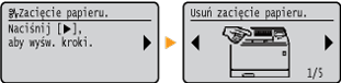 W niektórych sytuacjach po wystąpieniu błędu wyświetlone zostają wskazówki podające, jak na niego zareagować. Aby rozwiązać problem, należy postępować zgodnie z instrukcjami na ekranie. Poniżej jako przykład pokazano ekran wyświetlany w przypadku zacięcia papieru.