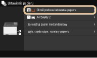 Po zarejestrowaniu ustawienia domyślnego ekran ustawień papieru nie jest wyświetlany przy jego ładowaniu i używana jest zawsze ta sama konfiguracja. Jeśli załadowany zostanie inny format lub typ papieru bez zmiany ustawień, urządzenie może nie drukować poprawnie. Aby uniknąć tego problemu, należy wybrać opcję <Określ podczas ładowania papieru> w kroku 3, a następnie załadować papier.