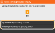 Jako wartość wywołującą wyświetlenie komunikatu można ustawić dowolną wartość procentową ilości toneru pozostałego w kasecie z tonerem. <Wyśw.czas koniecz. przyg.kas.>/<Wyśw. czas powiad. o koniecz. przyg.kas.>