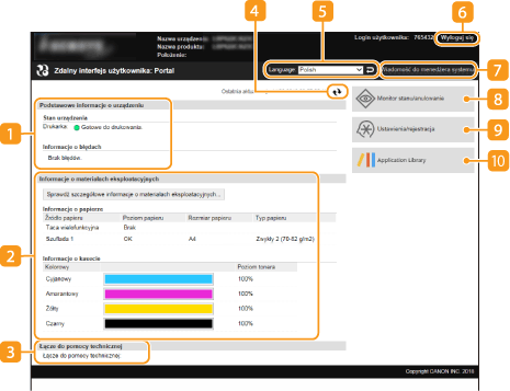 Po zalogowaniu się do Zdalnego interfejsu użytkownika zostanie wyświetlona następująca strona główna. W tej części opisano podstawowe czynności, a także elementy wyświetlane na stronie głównej.