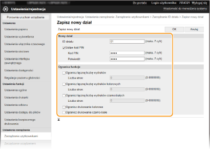 W odniesieniu do zarejestrowanych wydziałów można ograniczyć liczbę stron możliwych do wydrukowania, a także dostępność funkcji. Aby ograniczyć liczbę stron możliwych do wydrukowania, zaznacz pole wyboru obok wybranego typu ograniczenia i wprowadź odpowiednią liczbę stron w polu [Liczba stron]. Zaznacz pola wyboru obok funkcji, do których dostęp ma zostać ograniczony.