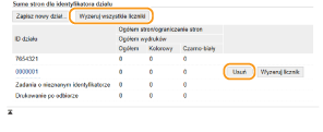 Aby wyzerować licznik wybranego identyfikatora, kliknij odpowiednie łącze tekstowe pod pozycją [ID działu], a następnie kliknij przycisk [Wyzeruj licznik]  [OK]. Aby wyzerować licznik dla wszystkich identyfikatorów działów, kliknij kolejno pozycje [Wyzeruj wszystkie liczniki]  [OK].
