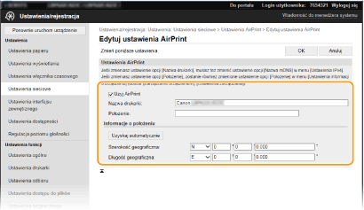 Pozwala sprawdzić wartości wprowadzone w ustawieniach AirPrint, takie jak nazwa i lokalizacja urządzenia. Przycisk [Edycja] pozwala zmienić ustawienia.