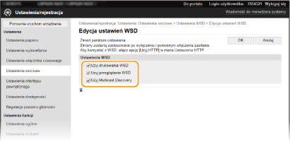 Zaznaczenie tego pola wyboru umożliwia uzyskanie informacji o urządzeniu przez komputer za pomocą interfejsu WSD. To pole wyboru jest zaznaczane automatycznie po zaznaczeniu pola wyboru [Użyj drukowania WSD]. [Użyj Multicast Discovery]