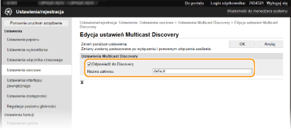 Zaznaczenie tego pola wyboru umożliwia skonfigurowanie urządzenia tak, aby odpowiadało na pakiety wyszukiwania metodą multiemisji programu do zarządzania urządzeniami oraz włączenie monitorowania za pomocą programu do zarządzania urządzeniami.