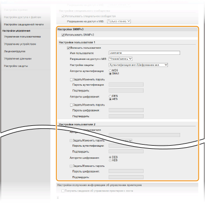 Если включены обе версии SNMP, рекомендуется задать для разрешений SNMPv1 на доступ к объектам MIB значение [Только чтение]. Разрешение на доступ к объектам MIB можно задать отдельно в SNMPv1 и SNMPv3 (а также для каждого из пользователей в SNMPv3). При выборе [Чтение/запись] (разрешение на полный доступ) в SNMPv1 снижает эффективность функций безопасности, которые отличают протокол SNMPv3, поскольку большинство параметров аппарата можно контролировать посредством SNMPv1.