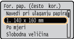 Veličine papira koje su registrirane u gornjem postupku mogu se pozivati kada se na zaslonu za odabir formata papira za ladicu papira ili višenamjensku ladicu odabere <Po mjeri>.
