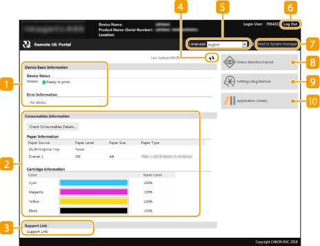 Kada se prijavite na Remote UI (Korisničko sučelje za daljinski pristup), pojavit će se sljedeća stranica portala. U ovom se odjeljku opisuju stavke koje su prikazane na stranici portala te osnovni postupci.