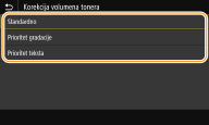 Pomoću postavke <Fino podešav.> ili <Gustoća (fino podeš.)> gustoću tonera za svaku boju možete prilagoditi na jednu od tri razine gustoće: velika gustoća, srednja gustoća i mala gustoća.