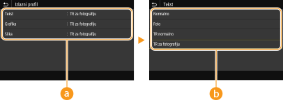 Konfigurira se postavka kojom se tekst crne boje za koju vrijedi "R = G = B = 0 %", "C = M = Y = 100 %" ili "C = M= Y = 0 % / K = 100 %" ispisuje samo crnim (K) tonerom. Ako je odabrana opcija <Isključ.> tekst se ispisuje na temelju postavke <Izlazni profil>.