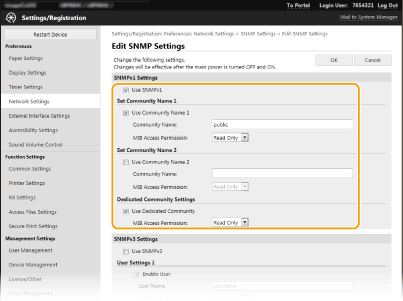 Jednostavan mrežni protokol za upravljanje (Simple Network Management Protocol, SNMP) protokol je za nadzor komunikacijskih uređaja na mreži i upravljanje njima pomoću baze podataka za upravljanje (Management Information Base, MIB). Uređaj podržava SNMPv1 i SNMPv3 s poboljšanim sigurnosnim značajkama. Možete s računala provjeriti stanje uređaja prilikom ispisa dokumenata ili korištenja sučelja Remote UI (Korisničko sučelje za daljinski pristup). Možete omogućiti SNMPv1 ili SNMPv3 ili oba istovremeno. Definirajte postavke za svaku od verzija u skladu s mrežnim okruženjem i svrhom korištenja.