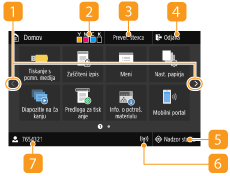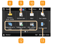 Pritisnite jo, da preverite stanje tiskanja, si ogledate zgodovino uporabe ali nastavitve omrežja, kot je naslov IP naprave. Preverite lahko tudi stanje naprave, na primer preostalo količino papirja in preostalo količino tonerja v kartušah s tonerjem ali morebitne napake. Zaslon <Nadzor stanja>