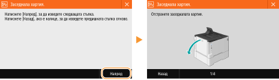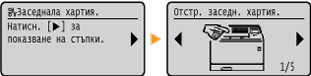 В някои случаи, когато възникне грешка, се извеждат инструкции как да се реагира при тази грешка. Следвайте инструкциите на екрана, за да отстраните проблема. Екранът, който се извежда при засядане на хартия, е показан по-долу като пример.