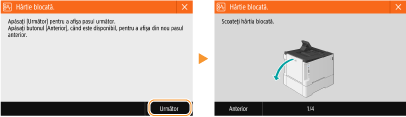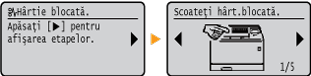 În anumite cazuri, când o eroare apare, sunt afişate instrucţiunile despre cum să acţionaţi pentru a remedia eroarea. Urmaţi instrucţiunile de pe ecran pentru a soluţiona problema. Mai jos este afişat ca exemplu ecranul care apare când are loc un blocaj de hârtie.