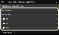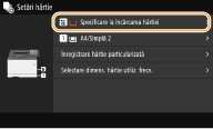După ce este înregistrată setarea implicită, ecranul pentru setarea hârtiei nu este afişat când încărcaţi hârtie şi este folosită aceeaşi setare mereu. Dacă încărcaţi o altă dimensiune de hârtie fără a modifica setările hârtiei, este posibil ca aparatul să nu imprime corect. Pentru a evita această problemă, selectaţi <Specificare la încărcarea hârtiei> în pasul 3, apoi încărcaţi hârtia.
