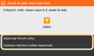 Puteţi seta orice valoare ca procentaj pentru nivelul de toner disponibil în cartuş care să declanşeze un mesaj. <Afiş. contor. pt. preg. cart.>/<Afişare contor. pt. notif. preg. cartuş>