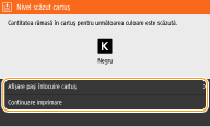 Dacă se afişează un mesaj pentru cartuşul de toner negru în timp ce este primit un fax prin Internet, aparatul nu imprimă ca să se evite imprimarea neclară. Pentru a continua imprimarea chiar dacă nivelul de toner rămas în cartuş este scăzut, setaţi <Cont. imp. cu niv.scăz. cart.>/<Contin. imprim. când niv. cart. e scăz.> la <Pornit>. <Cont. imp. cu niv.scăz. cart.>/<Contin. imprim. când niv. cart. e scăz.>