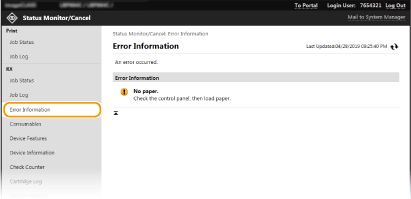 Când apare o eroare, această pagină se va afişa dacă faceţi clic pe mesajul afişat în [Error Information] din pagina Portal (pagina principală).