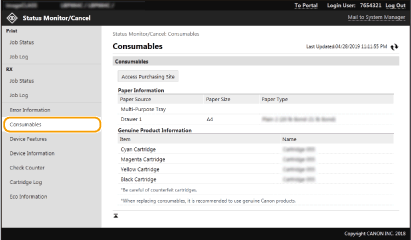 Se afişează formatul şi tipul de hârtie pentru sursa de hârtie, numărul de model al cartuşului de toner etc. De asemenea, puteţi face clic pe [Check Consumables Details] în pagina Portal (pagina principală) pentru a afişa această pagină (