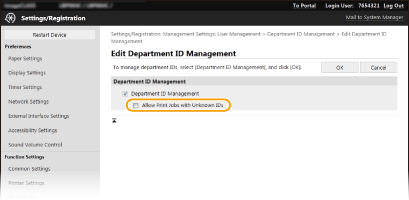 Activarea opţiunii Gestionare ID departament pentru lucrările de la computer). Totuşi, dacă este bifată caseta de selectare pentru această setare, lucrările sunt efectuate chiar dacă nu sunt introduse ID-ul şi codul PIN. Când doriţi să configuraţi o setare astfel încât să nu se efectueze nicio lucrare dacă nu sunt introduse ID-ul şi codul PIN de departament corecte, debifaţi caseta de selectare.