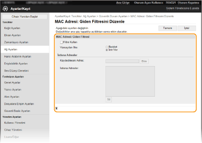 MAC adresleri yanlış şekilde girildiyse Uzak Kullanıcı Arabiriminden makineye erişemeyebilirsiniz ve bu durumda <MAC Adresi Filtresi> öğesini <Kapalı> olarak ayarlamanız gerekir. <MAC Adresi Filtresi>