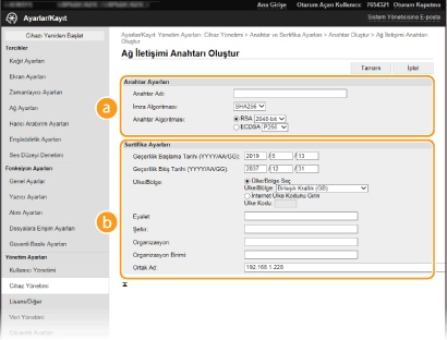Aktarım Katmanı Güvenliği (TLS) aracılığıyla şifrelenmiş iletişim için gerektiğinde, makine ile bir anahtar ve sertifika oluşturulabilir. Makineye Uzak Kullanıcı Arabirimi aracılığıyla erişirken TLS'yi kullanabilirsiniz. "Ağ İletişimi" içinde oluşturulan anahtar ve sertifika ile kendiliğinden imzalı sertifikalar kullanılır.
