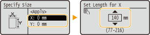 2 | Укажіть довжину сторін <X> і <Y>. Модель сенсорної панелі Виберіть <X> або <Y> і введіть довжину кожної сторони за допомогою цифрових клавіш. Модель чорно-білого РК-дисплея |