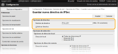 En el cuadro de texto [Nombre de directiva], introduzca caracteres alfanuméricos en el nombre que se utilizará para identificar la directiva.