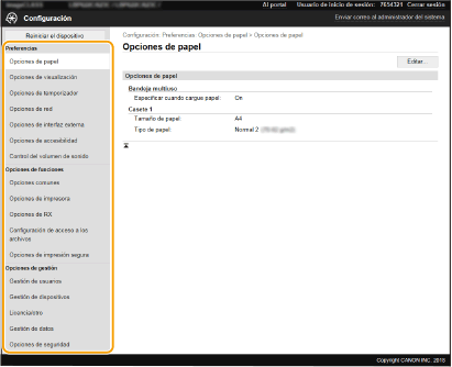 Puede cambiar las distintas opciones del equipo utilizando la IU remota. La mayoría de las opciones también pueden configurarse en el equipo, pero algunas opciones solo pueden configurarse a través de la IU remota. En esta sección se describe el flujo básico de cambio de las opciones del equipo a través de la IU remota.