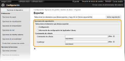 Los datos de opciones del equipo pueden guardarse en su ordenador (exportación). Los datos guardados en su ordenador también se pueden registrar en el equipo (importación). Los datos exportados desde este equipo se pueden importar en otro equipo del mimo modelo. Así, podrá copiar fácilmente varios datos de opciones en múltiples equipos. Para utilizar esas características, tiene que haber iniciado una sesión en el modo de Administrador del sistema. |