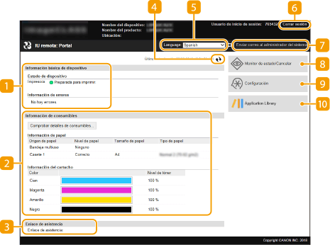 Al iniciar sesión en la IU remota aparece la siguiente página del Portal. En esta sección se describen los elementos que aparecen en la página del Portal y las operaciones básicas.