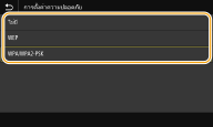 2 | เลือกวิธีการรับรองความถูกต้อง ![]() <ระบบเปิด> จะตั้งค่าการรับรองความถูกต้องระบบเปิด ซึ่งเรียกอีกอย่างหนึ่งว่า "การรับรองความถูกต้องแบบเปิด" <คีย์ที่ใช้ร่วมกัน> จะใช้คีย์ WEP เป็นรหัสผ่าน ![]() เมื่อเลือก <ระบบเปิด> เมื่อเชื่อมต่อกับ LAN แบบไร้สาย เครื่องจะพบข้อผิดพลาดในการรับรองความถูกต้อง หากการรับรองความถูกต้องคีย์ที่ใช้ร่วมกันถูกตั้งค่าบนเราเตอร์แบบไร้สาย หากเป็นเช่นนี้ เครื่องจะเปลี่ยนการตั้งค่าเป็น <คีย์ที่ใช้ร่วมกัน> โดยอัตโนมัติและพยายามเชื่อมต่ออีกครั้ง |