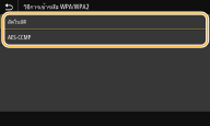2 | เลือกวิธีการเข้ารหัส ![]() <อัตโนมัติ> ตั้งค่าให้เครื่องเลือก AES-CCMP หรือ TKIP โดยอัตโนมัติเพื่อให้ตรงกับการตั้งค่าของเราเตอร์แบบไร้สาย <AES-CCMP> ตั้งค่า AES-CCMP เป็นวิธีการเข้ารหัส |