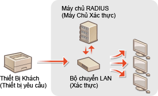 Máy in có thể kết nối như một thiết bị khách tới một mạng 802.1X. Một mạng 802.1X tiêu biểu bao gồm một máy chủ trên nền tảng RADIUS (máy chủ xác thực), bộ chuyển mạch LAN (trình xác thực) và các thiết bị khách với phần mềm xác thực (thiết bị phụ thuộc). Nếu một thiết bị cố gắng kết nối vào mạng 802.1X, thiết bị đó phải qua bước xác thực người dùng để chứng minh rằng kết nối được thực hiện bởi một người dùng được ủy quyền. Thông tin xác thực được gửi đến và kiểm tra bởi máy chủ RADIUS, máy chủ này cho phép hoặc từ chối truyền thông tới mạng tùy thuộc vào kết quả xác thực. Nếu không được xác thực, một bộ chuyển mạch LAN (hay một điểm truy cập) sẽ chặn truy cập từ bên ngoài vào hệ thống.