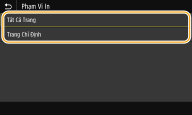 <Phạm Vi In> Chỉ định các trang bạn muốn in. <Tất Cả Trang> In tất cả các trang. <Trang Chỉ Định> Xác định phạm vi của các trang bạn muốn in. Nhập giá trị mong muốn trong mỗi <Trang Đầu Tiên> và <Trang Cuối Cùng> bằng các phím số, và chọn <Áp Dụng>. Khi phạm vi trang chỉ định không phù hợp với bất kỳ trang nào của tập tin PDF, thì việc in ấn sẽ không được thực hiện. |