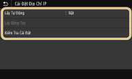 3 | Kiểm tra xem <IP Tự Động> được cài đặt thành <Bật> chưa. Nếu <Tắt> được chọn, hãy thay đổi cài đặt thành <Bật>. |
