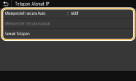 3 | Semak bahawa <IP Auto> ditetapkan kepada <Aktif>. Jika <Tak Aktif> dipilih, ubah tetapan kepada <Aktif>. |