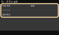 3 | <자동 IP>가 <설정>으로 지정되었는지 확인합니다. <해제>가 선택된 경우 설정을 <설정>으로 변경합니다. |